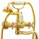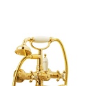 Назначение: ванна+душ • Конструкция: двухрычажный • Монтаж: вертикальный • Материал: покрытие - золото • Подводка: жесткая • Монтажные отверстия: 2 отверстия • Форма излива: традиционная • Душевая лейка в комплекте: есть • Держатель для душевой лейки: на смесителе