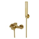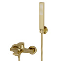 Керамический картридж 35мм, Sedal (Испания) Встроенный пластиковый аэратор Neoperl HONEYCOMB (Германия) для равномерного распределения струи Керамический поворотный переключатель Входит в комплект Лейка 1-функциональная с системой защиты от известковых отложений Шланг металлический 1500 мм, подключение к лейке Фиксированное настенное крепление для лейки Набор для монтажа Материалы Латунь, ABS-пластик, PVD-покрытие "матовое золото"